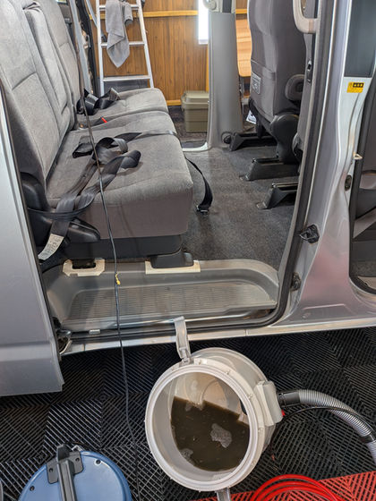 MAEDA工房の徹底洗浄では、ヤニを溶かしてから回収する手法で、シートの奥からどす黒いヤニ汚れをスッキリ回収!